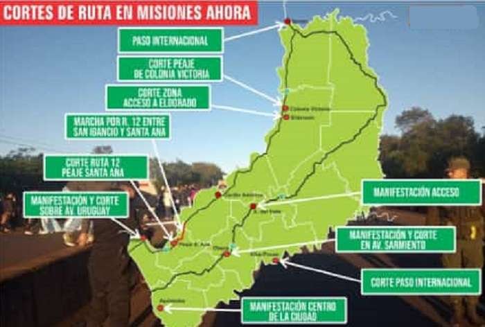 También hay cortes a la altura de los peajes de Santa Ana y Colonia Victoria en la Ruta 12, marchas dentro de Apóstoles y Oberá y fuera de San Ignacio y Aristóbulo del Valle, más una novedad respecto a los días anteriores: las movilizaciones a la aduana de Puerto Iguazú.
