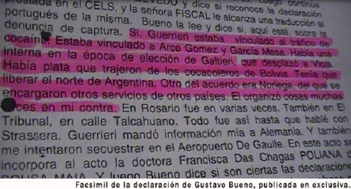 -… Sí, Guerrieri estaba vinculado al tráfico de cocaína. Estaba vinculado a Arce Gómez y García Meza. Había una interna en la época de elección de Galtieri, que desplazó a Viola. Había plata que trajeron de los cocacoleros de Bolivia. Tenía que liberar el norte de Argentina. Otro del acuerdo era Noriega, del que se encargaron otros servicios de otros países. Él organizó cosas muchas veces en mi contra. En Rosario fue en varias veces.-sostuvo Bueno, quien goza de un tratamiento muy especial en Brasil, según constató el juez Paulucci.