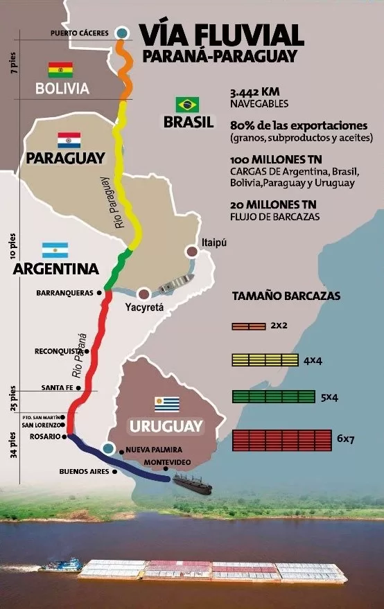 La vía fluvial Paraná-Paraguay cuyos 3.442 km llegan al corazón de América del Sur, forma parte de una unidad económica, productiva y demográfica denominada Cuenca del Plata cuyos territorios comparten Argentina, Brasil, Uruguay, Paraguay y Bolivia. Posee inmensos recursos: mineral de hierro, soja, subproductos, energía, madera, etc.
