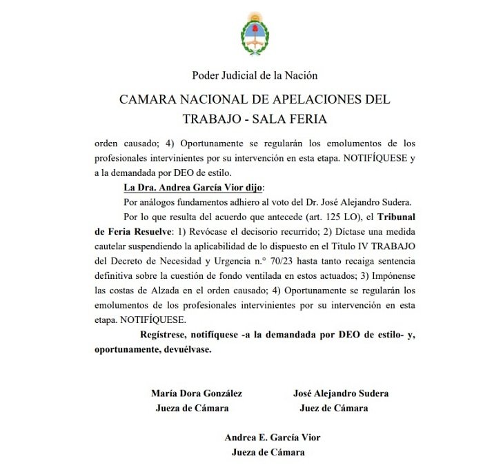 La decisión fue adoptada con los votos de los magistrados José Alejandro Sudera y Andrea García Vior, que integran la sala de feria de la Cámara del Trabajo, junto con la jueza Dora González, que postuló remitir la causa a la Cámara Contencioso Administrativo Federal para que defina qué fuero debe tramitar el expediente.