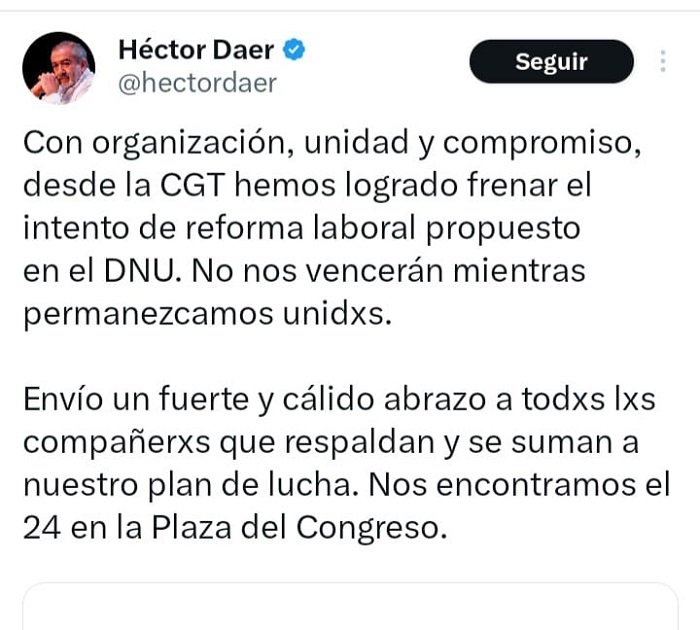 El secretario general de la CGT, Héctor Daer, expresó su postura sobre el fallo a través de la red social X. Destacó que “con organización, unidad y compromiso desde la CGT hemos logrado frenar el intento de reforma laboral propuesto por el DNU».