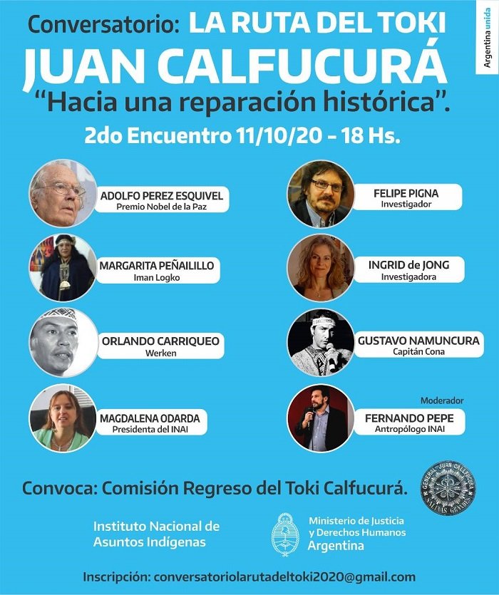 El 11 de octubre (del año 2020) se llevó a cabo el segundo conversatorio La ruta del Toki Juan Calfucurá. Hacia una reparación histórica, convocado por la Comisión Regreso del Toki Calfucurá.