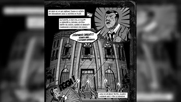 “El grupo que habíamos tomado el distrito, fuimos hacia la jefatura de policía. Allí Zapata a viva voz, le solicitó la rendición al personal apostado dentro, quienes respondieron con disparos. Luego de un breve tiroteo algunos lograron huir y otros se rindieron. Uno de los nuestros resultó herido Néstor Alderete, quién fue trasladado al hospital donde le extrajeron la bala los doctores Luis Parra y Luis Barreiro”.