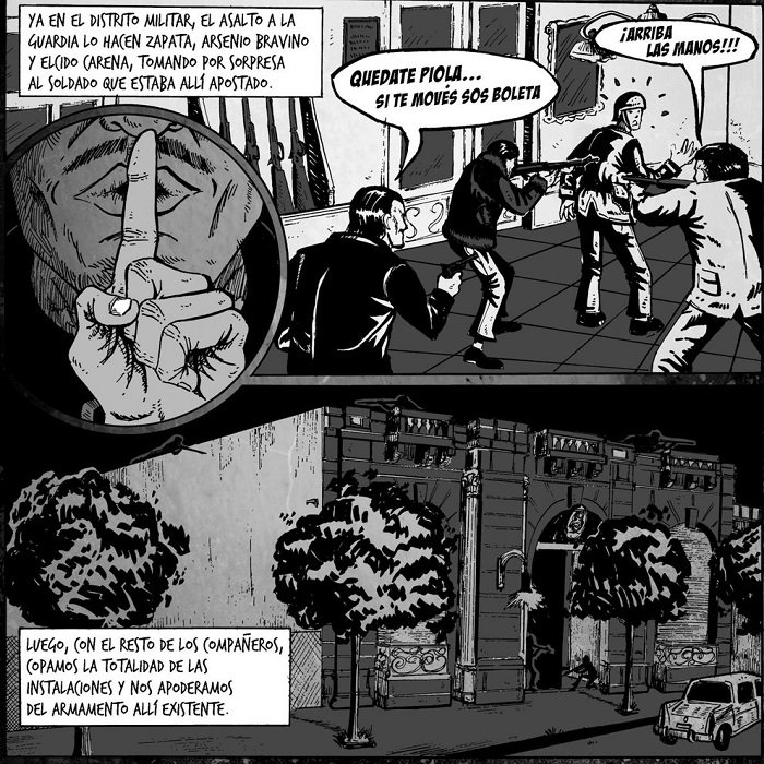 “Quien estaba a cargo, Zapata, decide no esperar mas y arenga “quienes quieran seguirme, que me sigan”. -Sigue contando Maina– “Todos sin excepción, nos dirigimos hacia el Distrito Militar. Zapata, Arsenio Bravino y Elcidio Carena, tomaron por sorpresa al soldado de guardia. Luego, los demás copamos la totalidad de las instalaciones y nos apoderamos del armamento allí existente.”