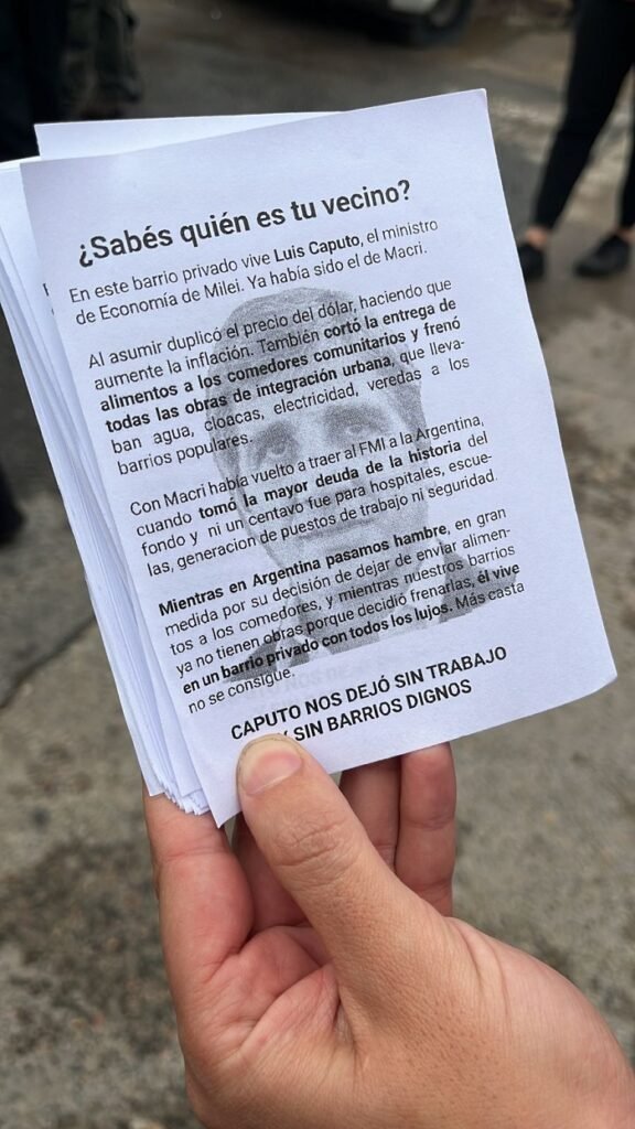 “Mientras en la Argentina pasamos hambre, en gran medida por su decisión de dejar de enviar alimentos a los comedores, y mientras nuestros barrios ya no tienen obras porque decidió frenarlas, él vive en un barrio privado con todos los lujos. Más casta no se consigue”, decía el texto.