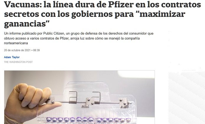 Esto y lo oneroso de los contratos de Pfizer apareció en un artículo de The Washington Post reproducido por La Nación el día 20 de octubre de 2021.
