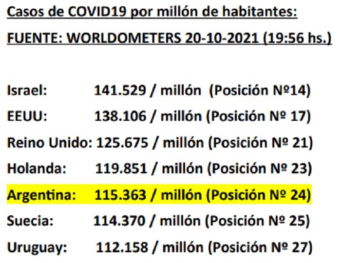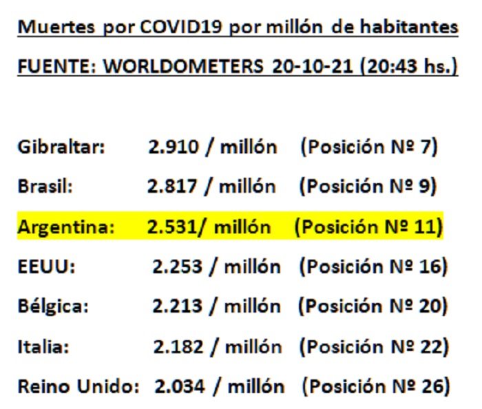 Y a pesar de estas comparaciones entre realidades incomparables, la ubicación argentina en la pandemia no es la peor, como afirman los conservadores de la entrega del patrimonio y el trabajo argentinos.