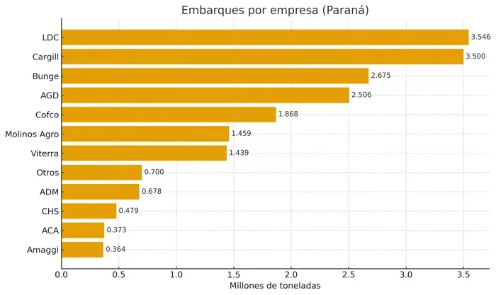 Como explica el gráfico elaborado por Agrofy en base a las declaraciones juradas presentadas los días de retenciones cero las principales empresas agroexportadoras como Bunge (EEUU), Dreyfus (Francia), Cofco (China), Viterra (Inglesa-EEUU) y Cargill (EEUU) se quedaron con el beneficio.